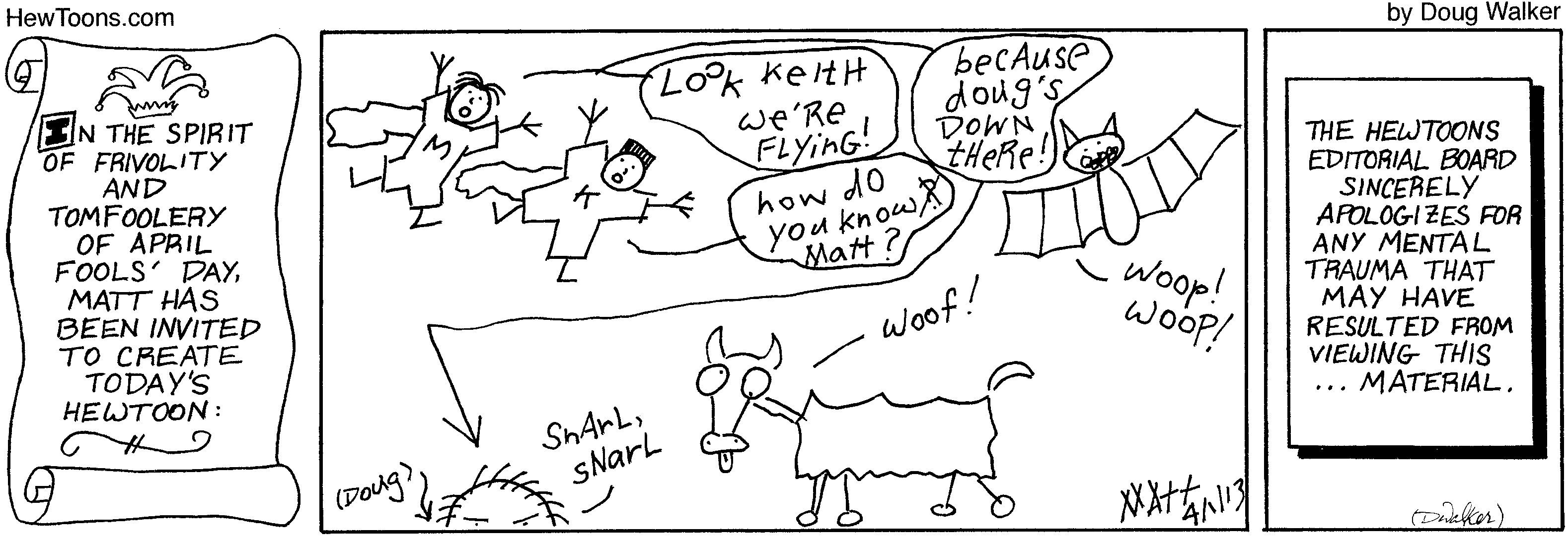 Frivolity and Tomfoolery April 1, 2013 Click the image for a larger version. Click the title to view comments. See the About page for a link to the first HewToon strip. Next HewToon: Tuesday, 4/2/13 Share this: Share on X (Opens in new window) X Share on Facebook (Opens in new window) Facebook Share on Pinterest (Opens in new window) Pinterest Email a link to a friend (Opens in new window) Email Like Loading... Related